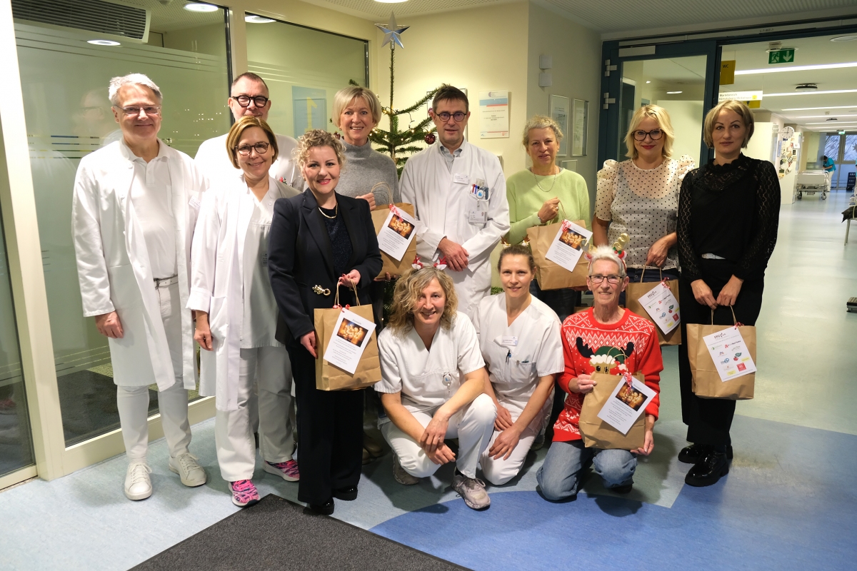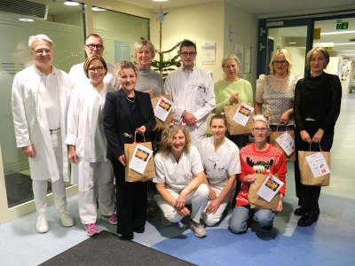 Patienten des Onkologischen Zentrums am Klinikum St. Marien Amberg haben deswegen jetzt eine kleine Weihnachtsüberraschung überreicht bekommen – initiiert vom Förderverein für Familiengesundheit Oberpfalz (FFGO e.V.). So gab es sowohl für die Patienten der gynäkologischen Onkologie, als auch der Praxis für Hämatologie und Onkologie und der Strahlentherapie von Chefarzt Dr. Matthias Hipp Weihnachtssäckchen gefüllt mit allerlei Pflegeprodukten für die onkologische Hautpflege, Duft-Roll-On's mit ätherischen Ölen, Süßes sowie diverse Dekoartikel. Die Aktion gibt es bereits seit mehreren Jahren. Der Förderverein FFGO e.V. unterstützt das Klinikum seit vielen Jahren, im Besonderen die Abteilung für Integrative Onkologie. „Es gibt doch kein schöneres Gefühl als zu wissen, dass andere in solchen Situationen an einen denken gerade zum Weihnachtsfest", freuen sich der Ärztliche Leiter der MVZ-Praxis für Hämatologie und Internistische Onkologie Dr. Ludwig Fischer von Weikersthal, Chefarzt Dr. Matthias Hipp sowie Oberarzt Dr. Jochen Pfirstinger, Leiter der Sektion Hämatologie, Onkologie, Palliativmedizin. „Es ist eine wunderschöne Geste für die wir uns ganz herzlich bedanken."
