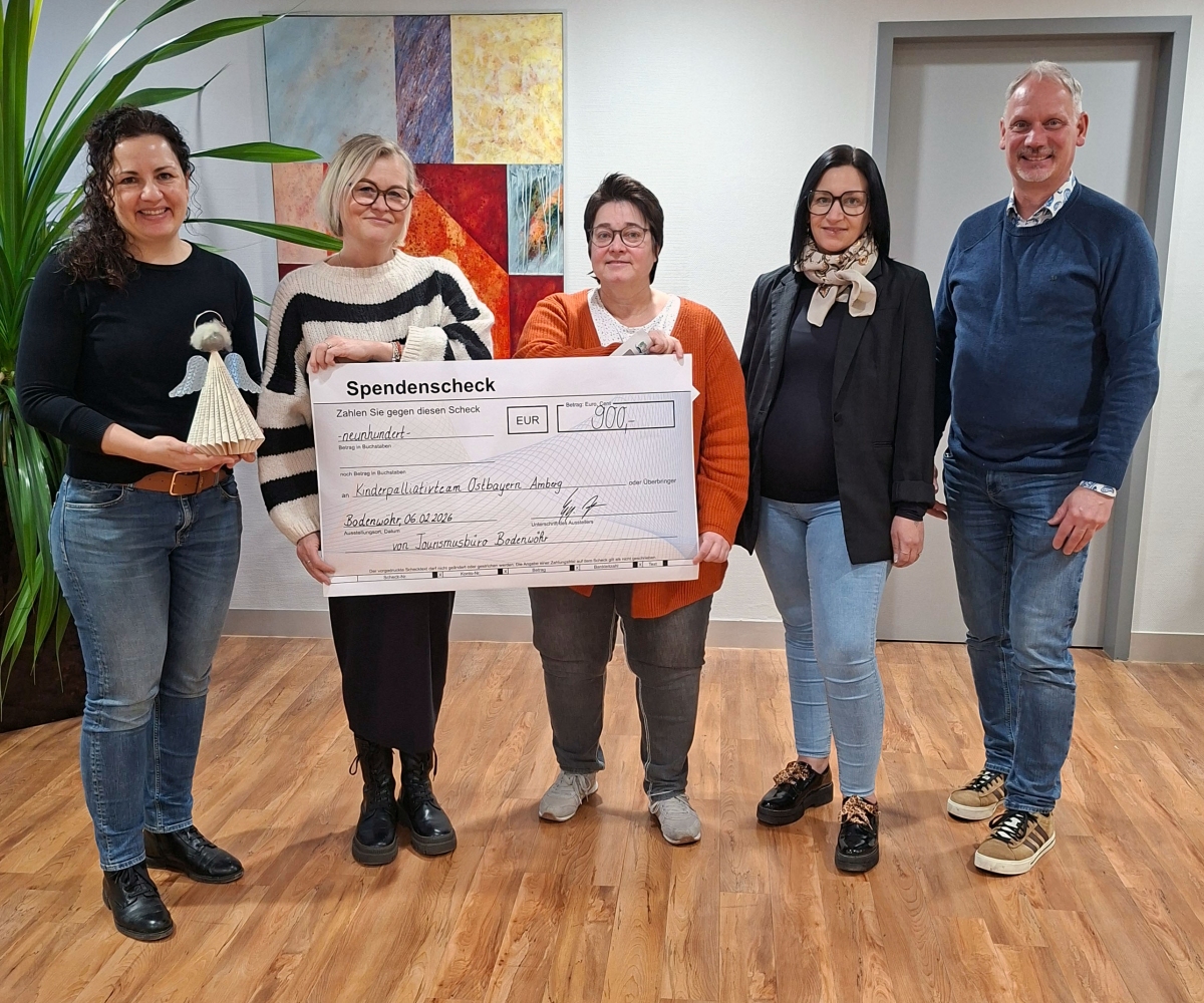 Mit einer kreativen Idee hat das Tourismusbüro Bodenwöhr kurz vor Weihnachten Gutes getan: Aus alten Buchseiten wurden liebevoll Engel, Bäumchen und kleine Weihnachtsmänner gebastelt, die anschließend verkauft wurden. Der Erlös in Höhe von 900 Euro wurde jetzt an das Kinderpalliativteam Ostbayern übergeben. Bei der Spendenübergabe waren neben dem Team des Tourismusbüros auch Bürgermeister Georg Hoffmann mit von der Partie. Jana Fickel und Christina Neiß vom Kinderpalliativteam freuten sich sehr über die Unterstützung, die für die Begleitung schwerstkranker Kinder und deren Familien verwendet wird. „Solche Spenden helfen uns, unsere Arbeit weiterhin individuell und menschlich zu gestalten", betonten sie dankbar.